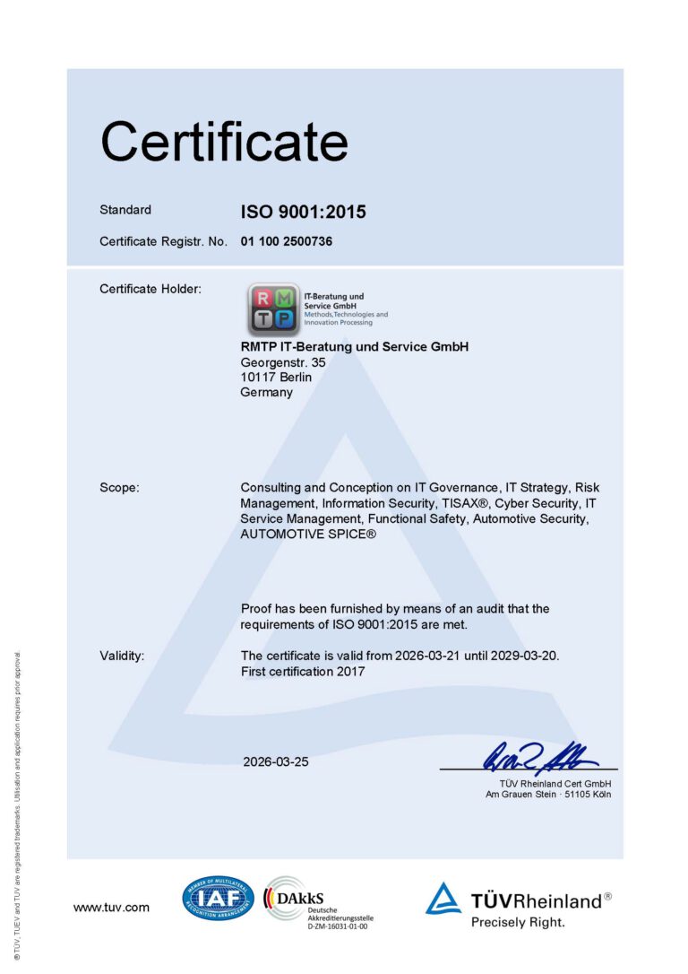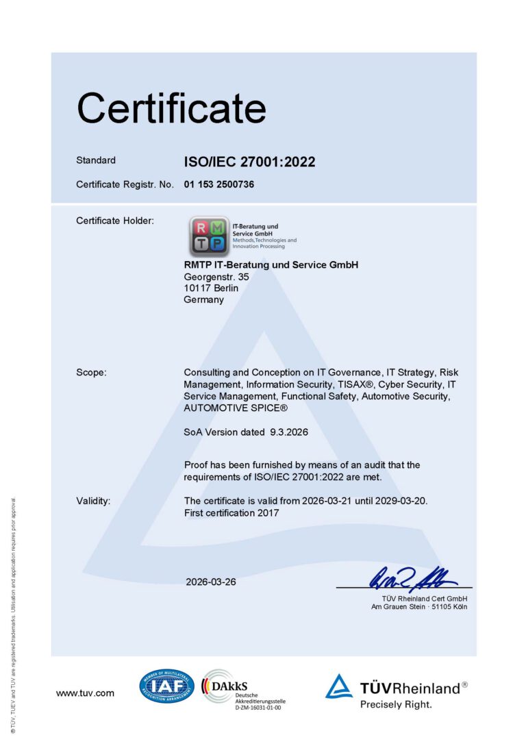RMTP IT-Beratung und Service GmbH has been TISAX® certified since 2018 for the handling of data with high and very high protection requirements, protection of prototype parts and components and data protection with special categories of personal data.