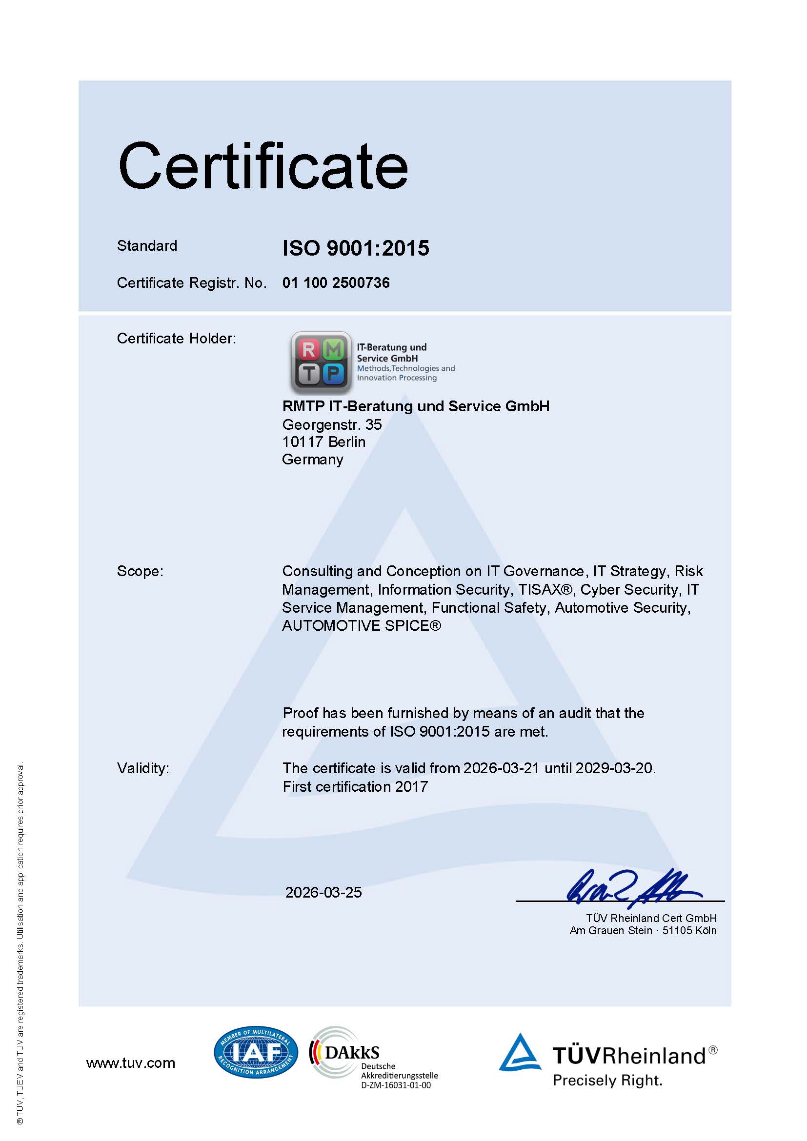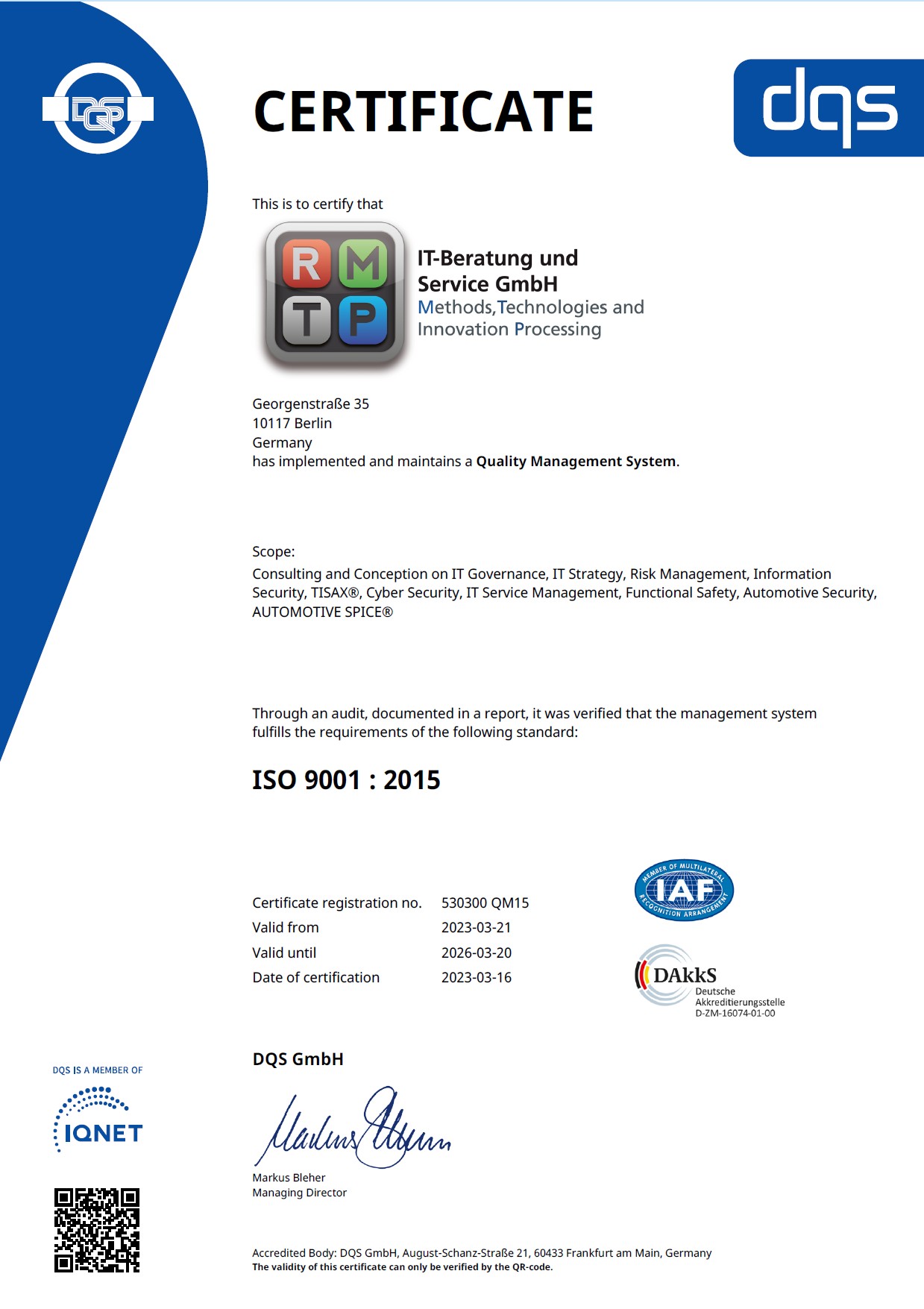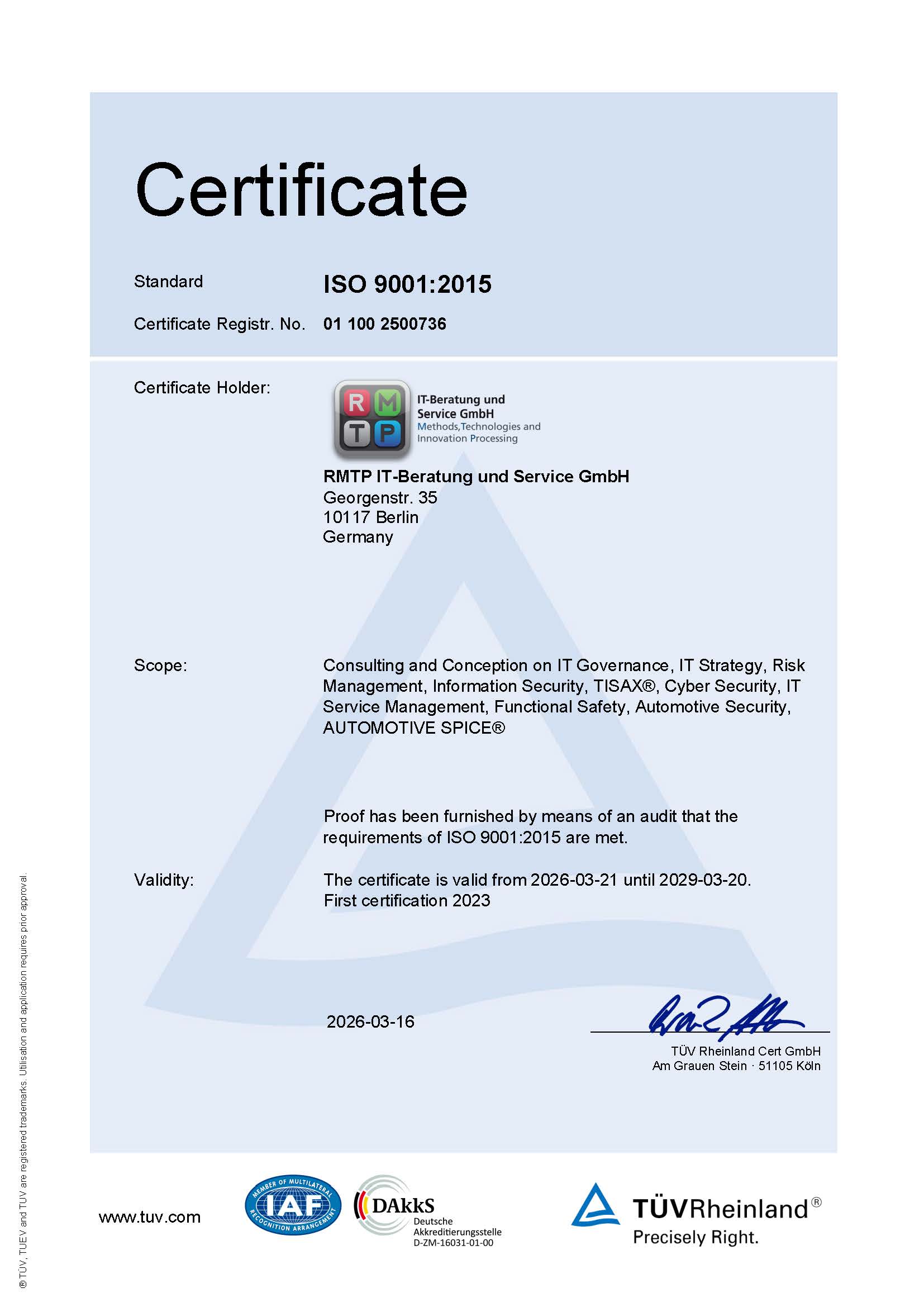 TISAX assessments are carried out by accredited assessment service providers who regularly provide evidence of their qualifications. TISAX® results are not publicly accessible, but can only be accessed by registered users via the ENX portal. The scope ID and assessment ID for RMTP IT-Beratung und Service GmbH are S78KTH and ATRVFY respectively.