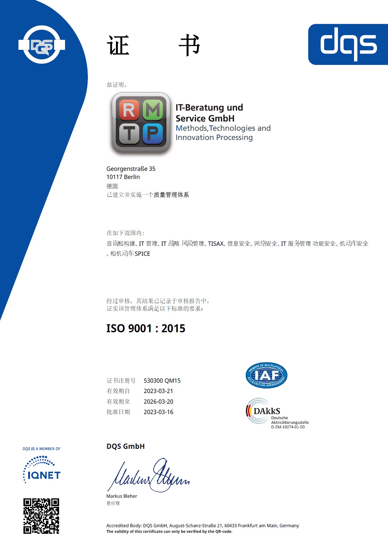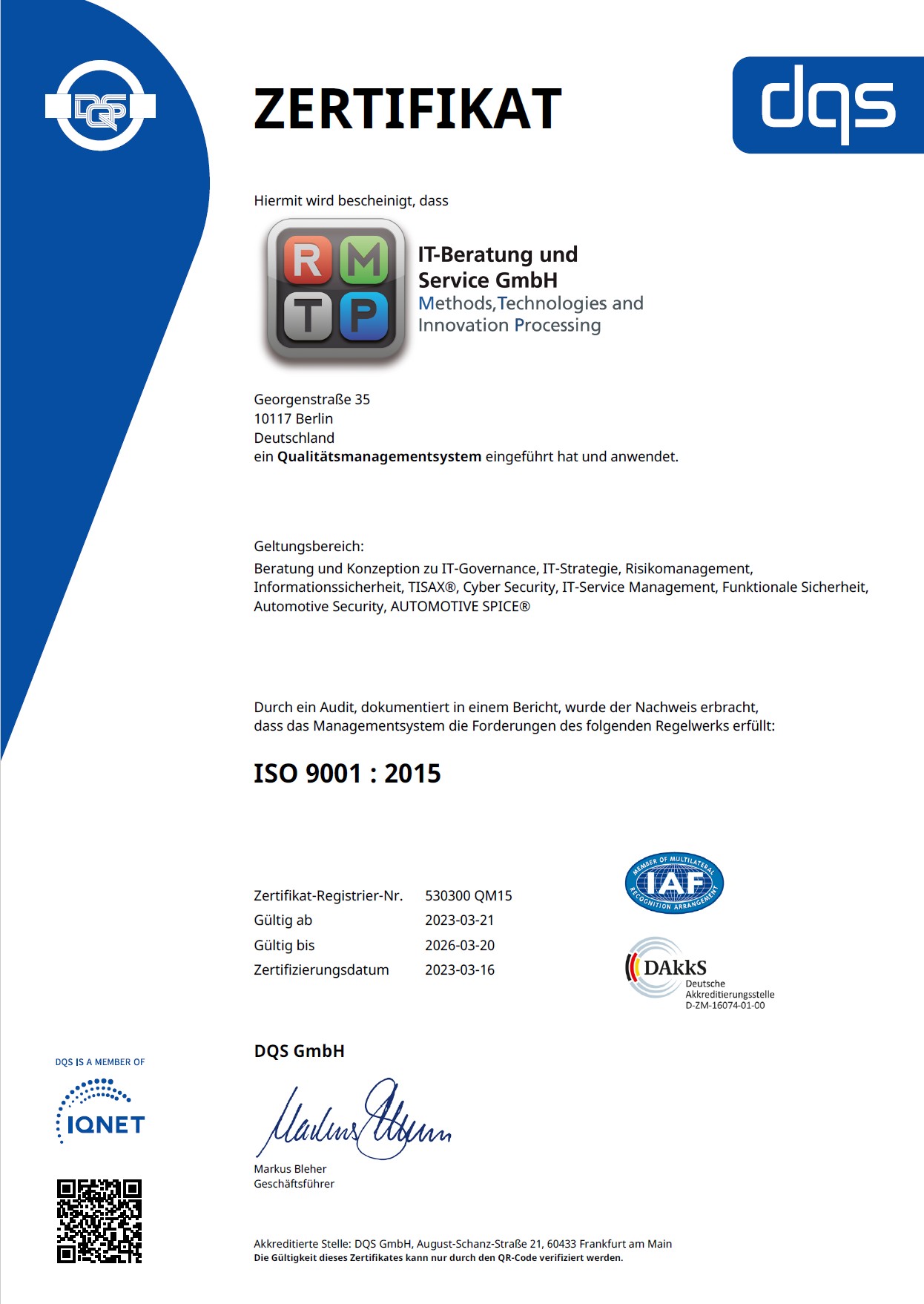 The effectiveness of this methodology was proven by an external certification of the quality management DIN ISO 9001:2015 and for the management of information security DIN ISO 27001:2022 in all existing competence fields of the consultancy.