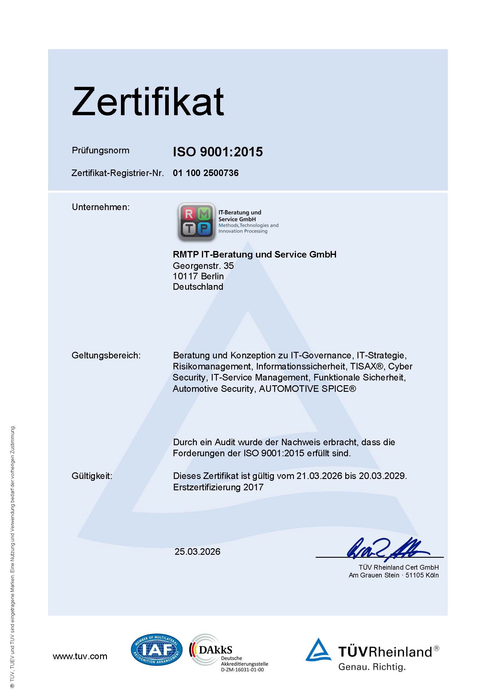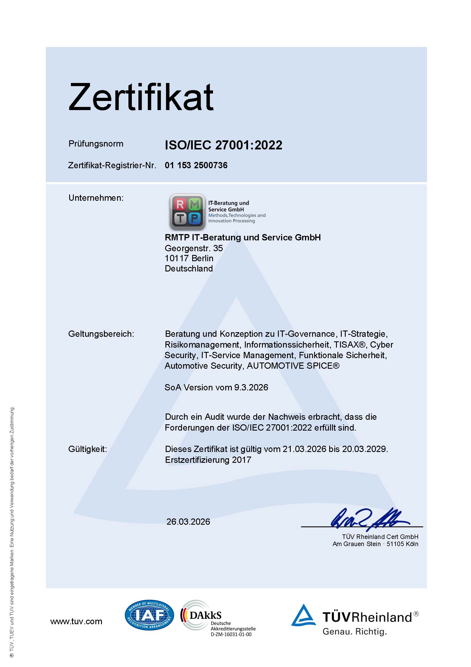 TISAX-Assessments werden von akkreditierten Prüfdienstleistern durchgeführt, die ihre Qualifikation regelmäßig nachweisen. TISAX®-Ergebnisse sind nicht öffentlich zugänglich, sondern können nur von registrierten Benutzern über das ENX-Portal abgerufen werden. Die Scope-ID und Assessment-ID für RMTP IT-Beratung und Service GmbH lauten S78KTH bzw. ATRVFY.